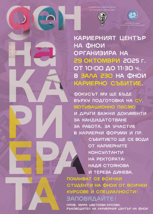 Кариерният център на ФНОИ организира на 29 октомври 2025 г. от 10.00 до 11.30 часа в зала 230 на ФНОИ кариерно събитие.