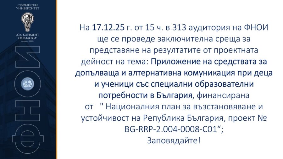 Представяне на резултатите от проектната дейност на тема: Приложение на средствата за допълваща и алтернативна комуникация при деца и ученици със специални образователни потребности в България